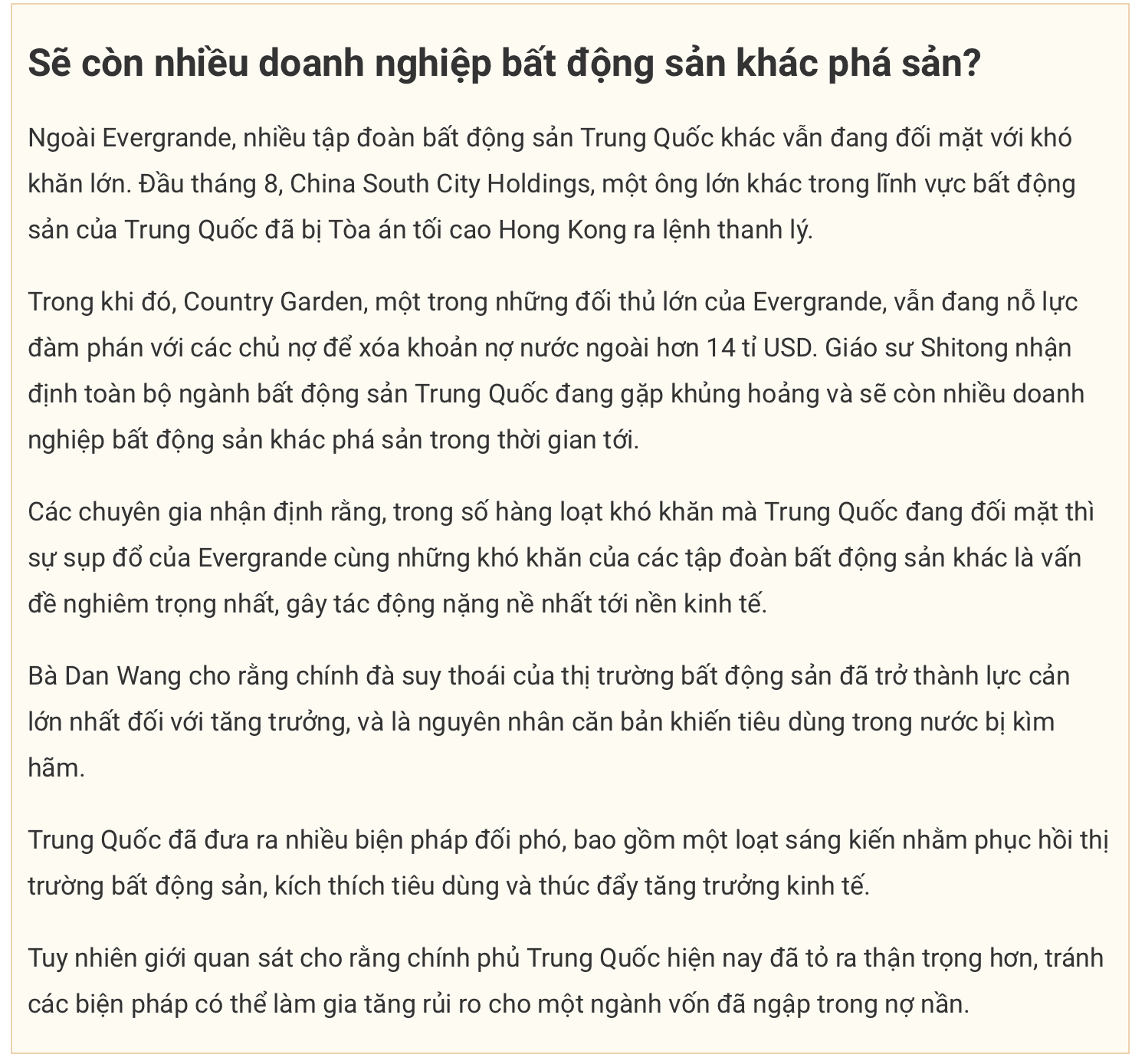 Giáo sư Qiao Shitong của Đại học Duke (Mỹ) cũng đồng tình với nhận định trên, nhấn mạnh vấn đề còn lại chỉ là xác định chủ nợ nào sẽ được thanh toán cũng như mức độ họ có thể thu hồi trong quá trình thực hiện các thủ tục phá sản.